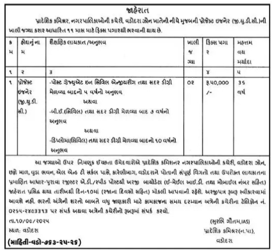 Vadodara Bharti 2025 (વડોદરા ભરતી 2025) : જો તમે વડોદરામાં રહેતા હો અને સારી નોકરીની શોધમાં છો તો તમારા માટે સુવર્ણ તક આવી ગઈ છે. પ્રાદેશિક કમિશનર, નગરપાલિકા કચેરી, વડોદરા ઝોન દ્વારા પ્રોજેક્ટ ઈજનેર (GUDC)ની જગ્યાઓ માટે ભરતીની જાહેરાત બહાર પડી છે. ખાસ વાત એ છે કે આ માટે કોઈ પરીક્ષા નહીં લેવાય, માત્ર લાયક ઉમેદવારની પસંદગી કરી 11 મહિનાના કરાર આધારિત નિમણૂંક આપવામાં આવશે.